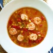 This soup starts with a bit of roux and the Cajun trinity of onions, bell pepper, and celery. Its spicy tomatoey broth balances the sweetness of the corn and flavorful shrimp.