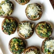 These healthy and delicious stuffed mushrooms have a little heat from red pepper flakes and a little crunch on top with or without the parmesan sprinkle. Easy to prepare as a snack, appetizer, meatless meal, or side dish.