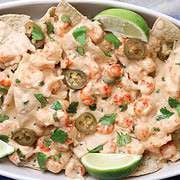 - Spoon over layers of tortilla chips on a tray or shallow dish and garnish with celantro, jalapeno pepper slices, and lime wedges.