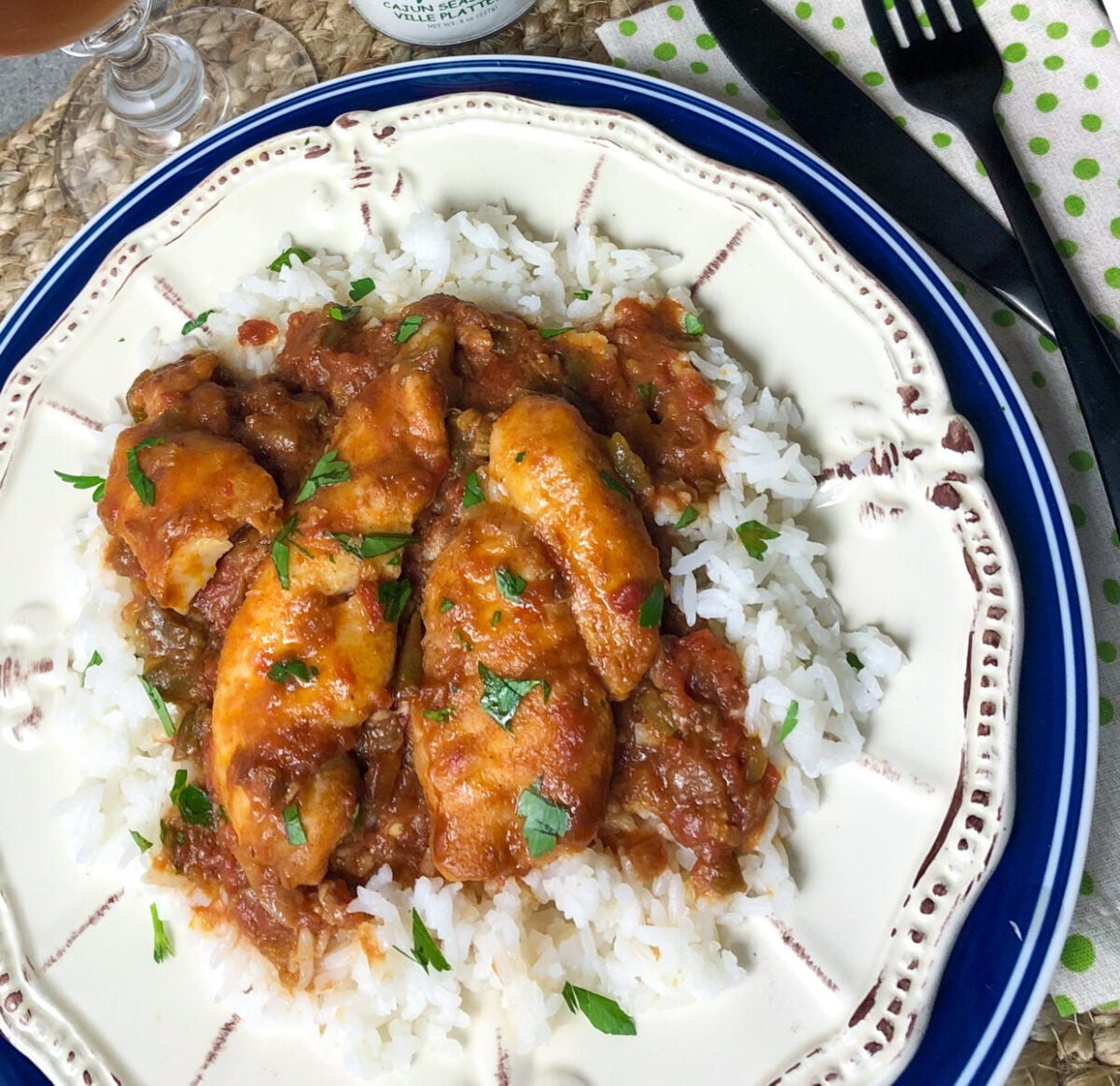 - Garnish with parsley and serve the fish with gravy over rice.