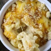 This Creamy Mac And Cheese is decadent comfort food baked with a creamy, 3-cheese sauce topped with breadcrumbs and more cheese flavor.